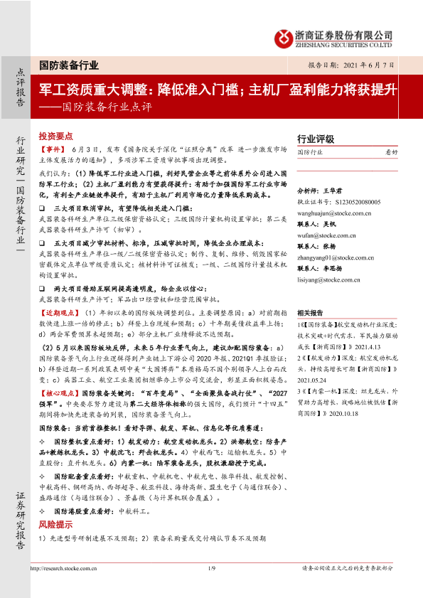 【浙商证券】【20210607】国防装备行业点评:军工资质重大调整:降低准入门槛;主机厂盈利能力将获提升-9页