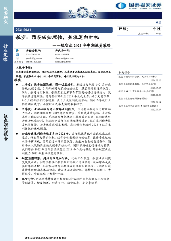 【国泰君安证券】【20210614】航空业2021年中期投资策略:预期回归理性,关注逆向时机-11页
