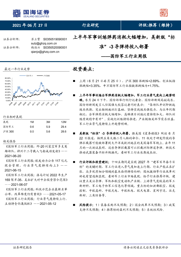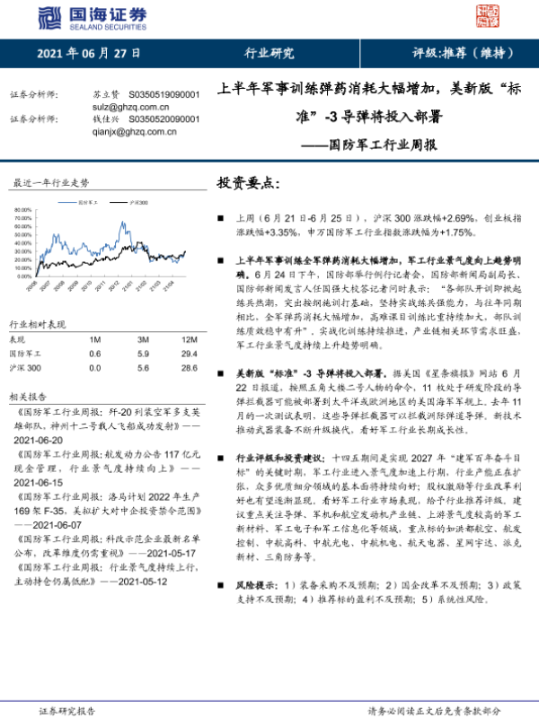 【国海证券】【20210627】20210627-国海证券-国防军工行业周报:上半年军事训练弹药消耗大幅增加,美新版“标准”-3导弹将投入部署-10页
