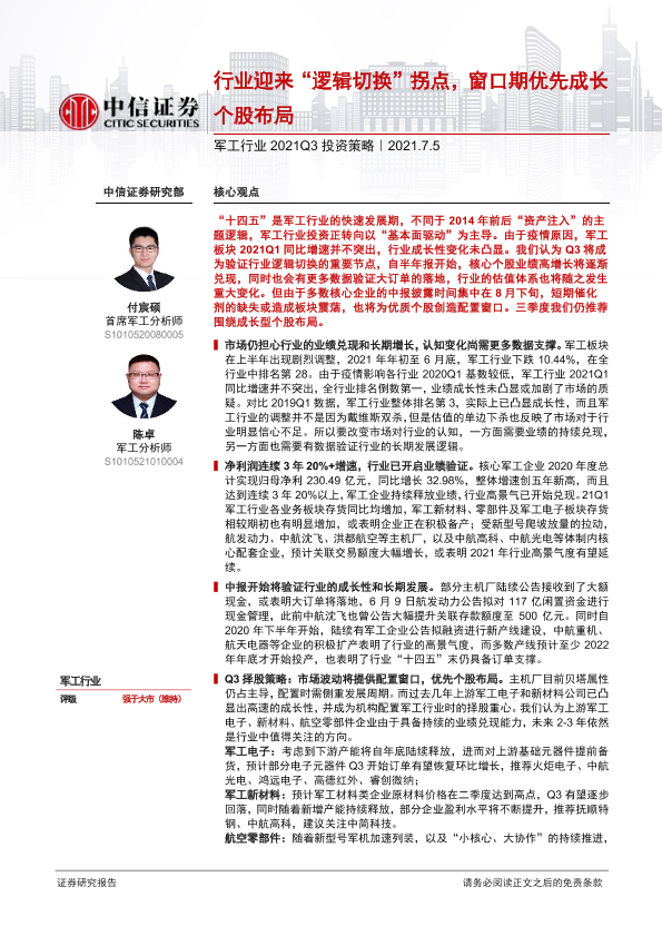 【中信证券】【20210705】军工行业2021Q3投资策略:行业迎来“逻辑切换”拐点,窗口期优先成长个股布局-16页