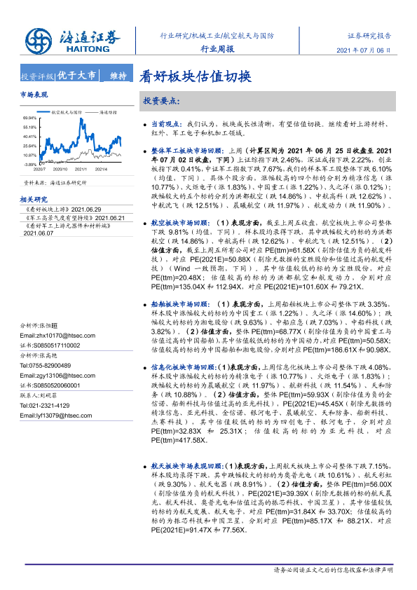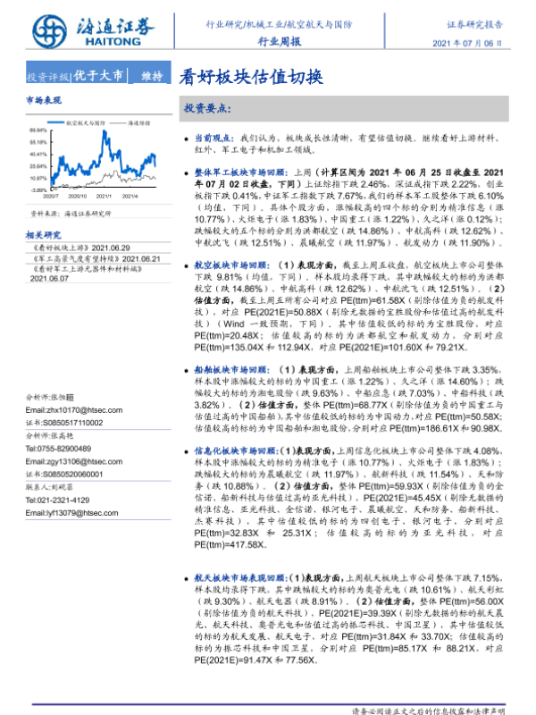 【海通证券】【20210706】20210706-海通证券-航空航天与国防行业周报:看好板块估值切换-4页
