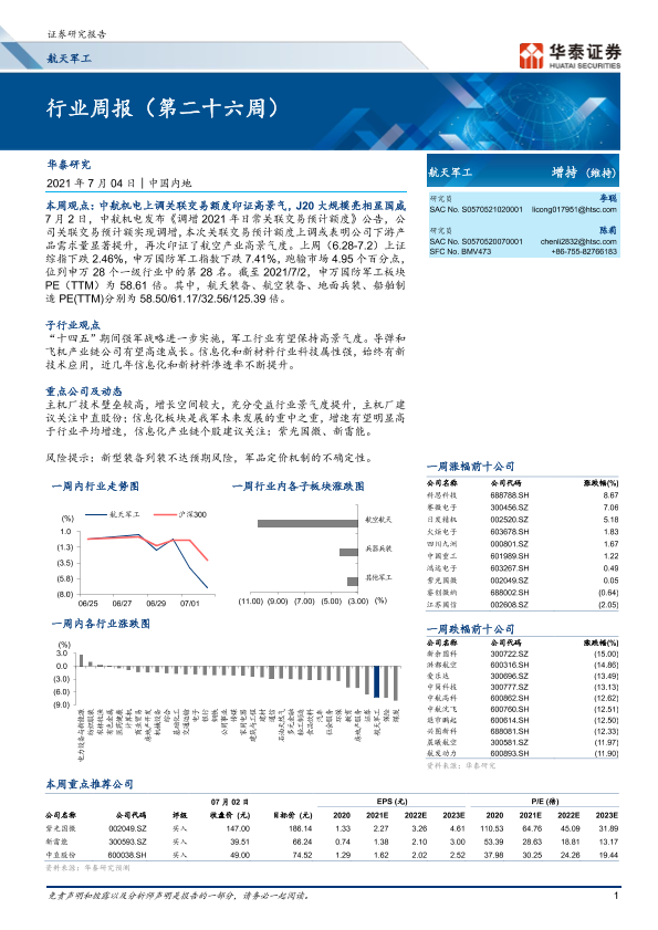【华泰证券】【20210704】20210704-华泰证券-航天军工行业周报(第二十六周)-14页