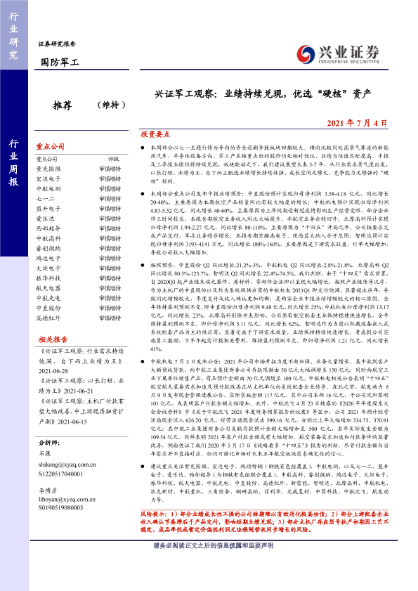 【兴业证券】【20210704】兴证军工观察:业绩持续兑现,优选“硬核”资产-14页