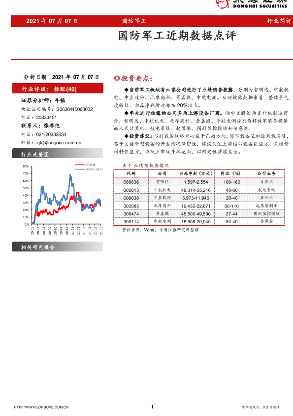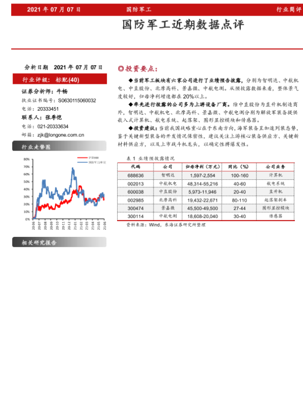 业绩预告 国防军工 投资建议 行业简评 证券分析