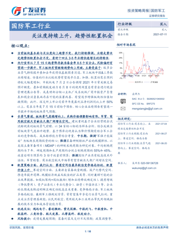 【广发证券】【20210711】国防军工行业投资策略周报:关注度持续上升,趋势性配置机会-16页