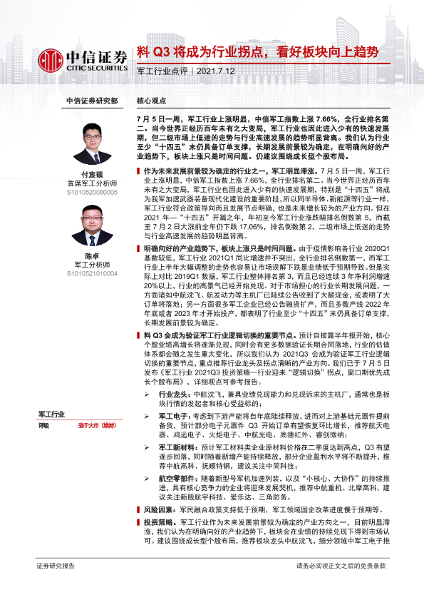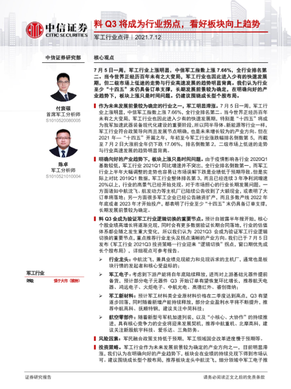 【中信证券】【20210712】20210712-中信证券-军工行业点评:料Q3将成为行业拐点,看好板块向上趋势-3页