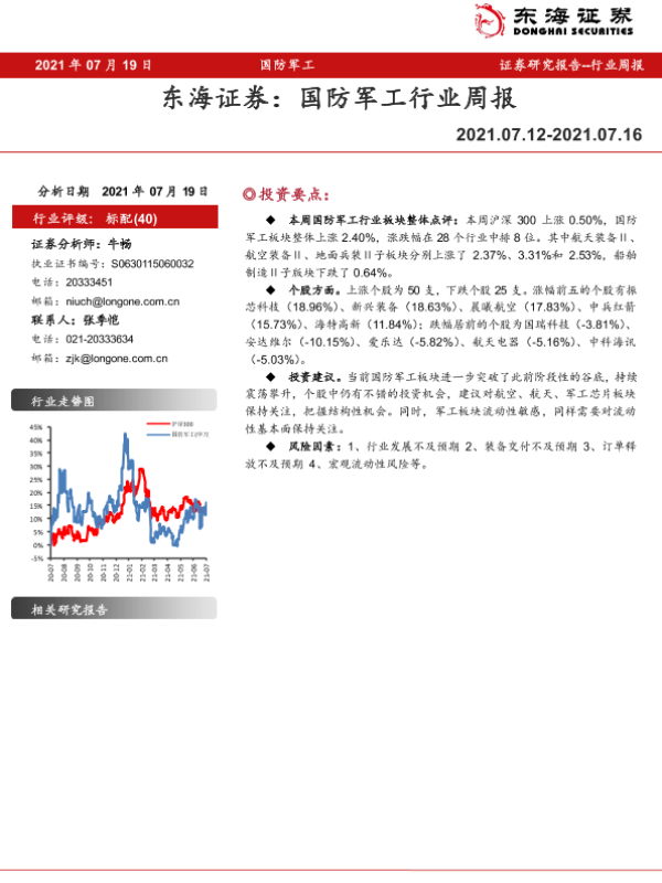 国防军工 市场表现 投资建议 股市分析 行业周报