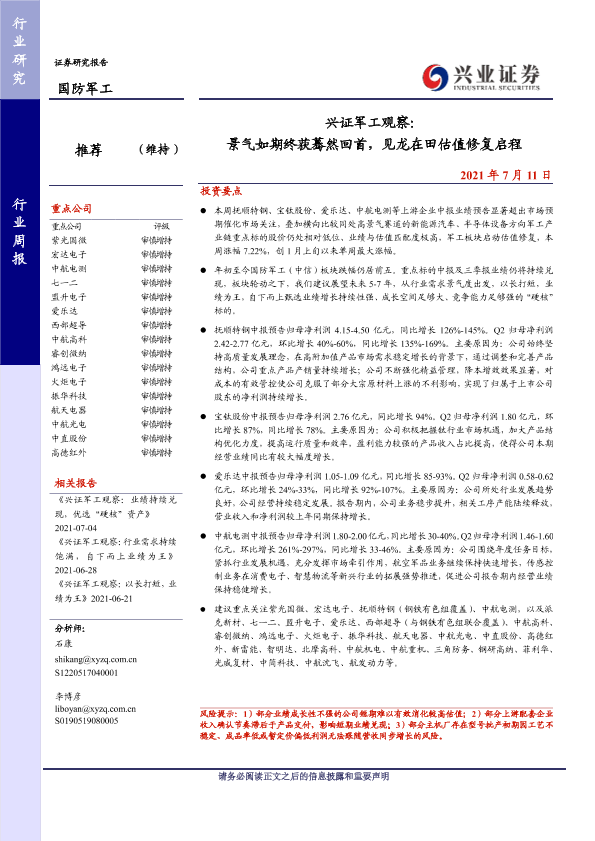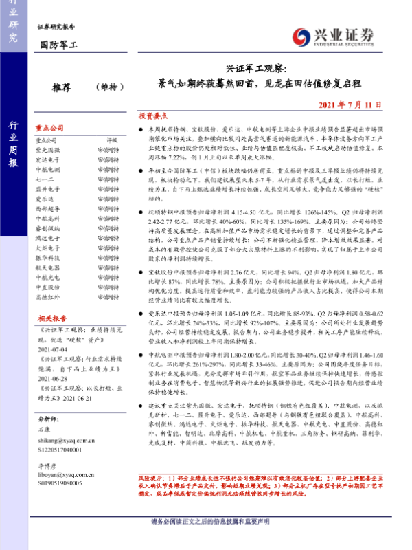 【兴业证券】【20210711】兴证军工观察:景气如期终获蓦然回首,见龙在田估值修复启程-15页