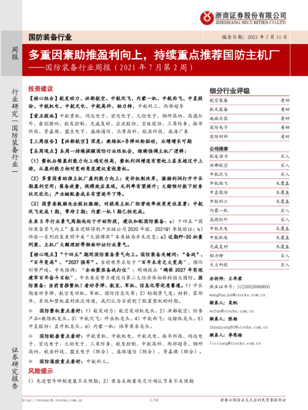 【浙商证券】【20210711】20210711-浙商证券-国防装备行业周报(2021年7月第2周):多重因素助推盈利向上,持续重点推荐国防主机厂-14页