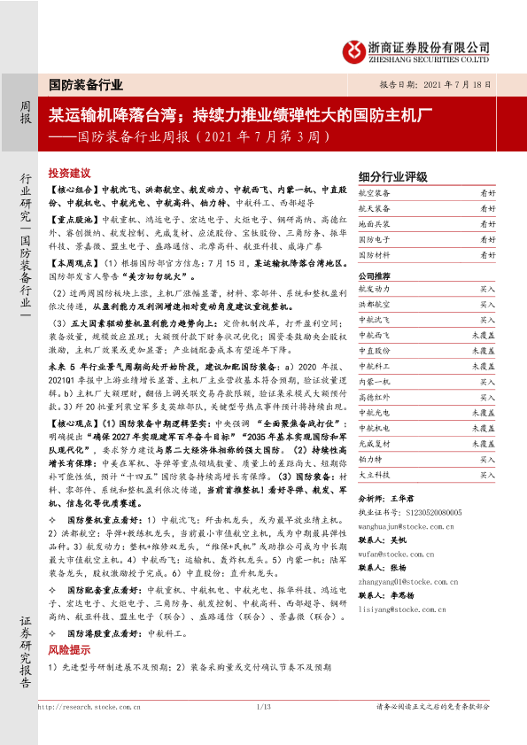 【浙商证券】【20210718】20210718-浙商证券-国防装备行业周报:某运输机降落台湾;持续力推业绩弹性大的国防主机厂-13页