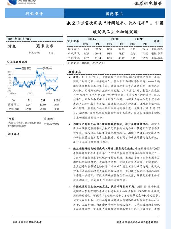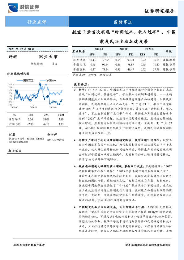 【财信证券】【20210802】国防军工行业点评:航空工业首次实现“时间过半、收入过半”,中国航发民品主业加速发展-3页