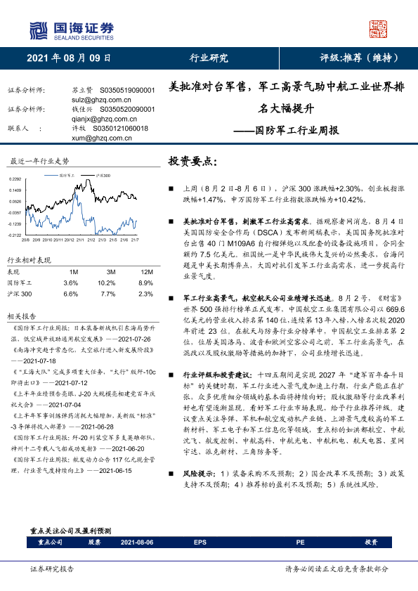 【国海证券】【20210809】国防军工行业周报:美批准对台军售,军工高景气助中航工业世界排名大幅提升-10页