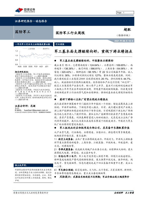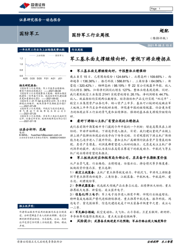 【国信证券】【20210815】国防军工行业周报:军工基本面支撑继续向好,重视下游业绩拐点-14页
