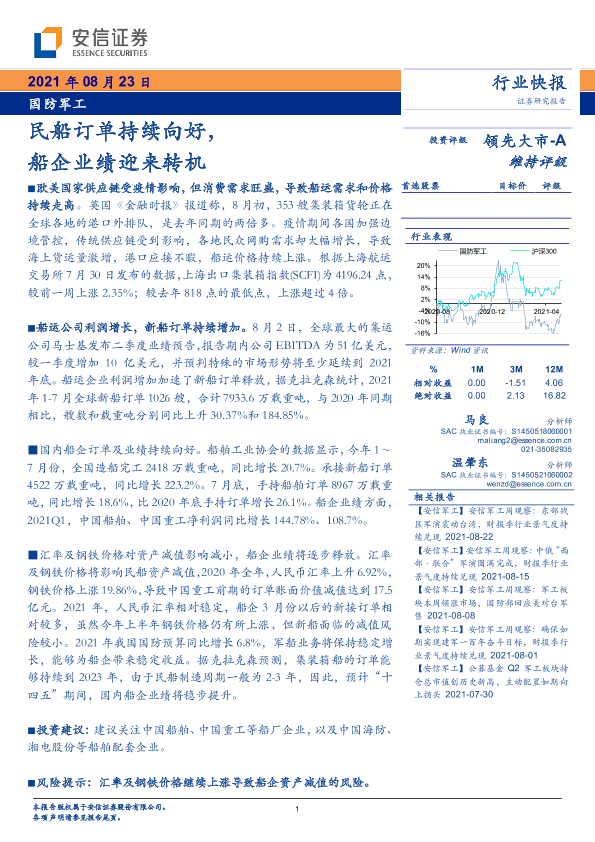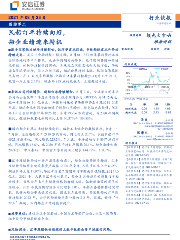 【安信证券】【20210823】国防军工:民船订单持续向好,船企业绩迎来转机-3页