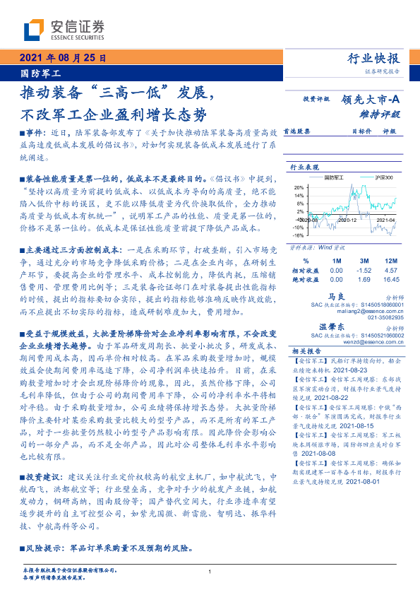 【安信证券】【20210825】推动装备“三高一低”发展,不改军工企业盈利增长态势-5页