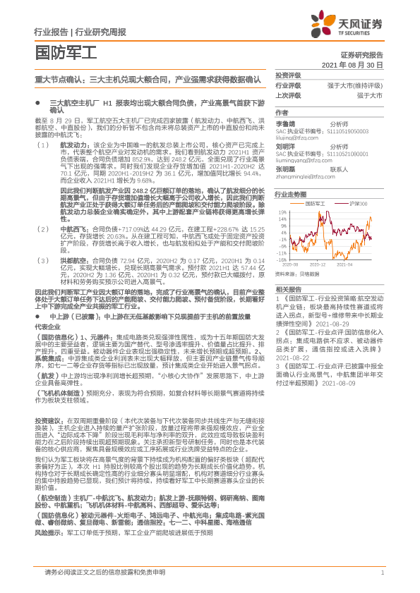 【天风证券】【20210830】国防军工:行业重大节点确认:三大主机兑现大额合同,产业强需求获得数据确认-3页