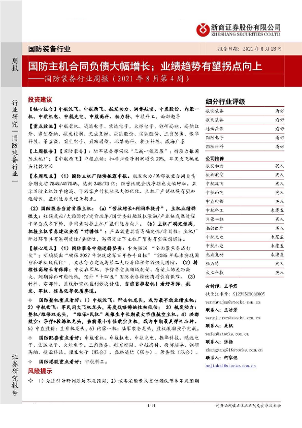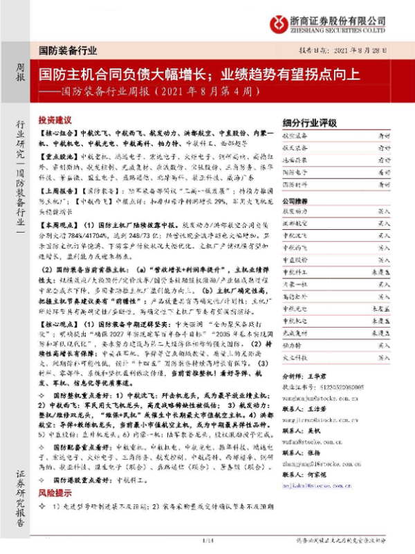 【浙商证券】【20210828】国防装备行业周报(2021年8月第4周):国防主机合同负债大幅增长;业绩趋势有望拐点向上-14页