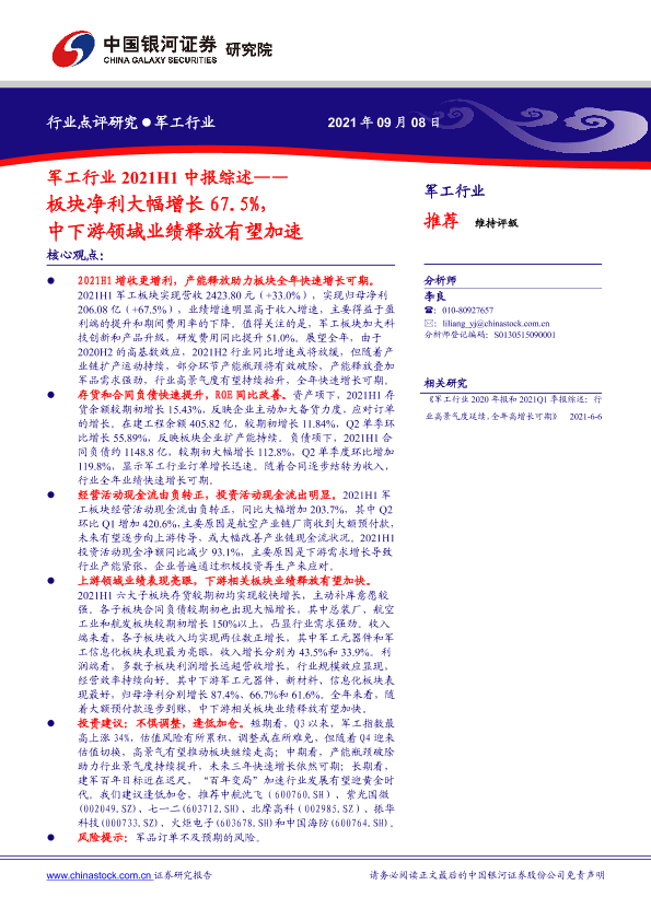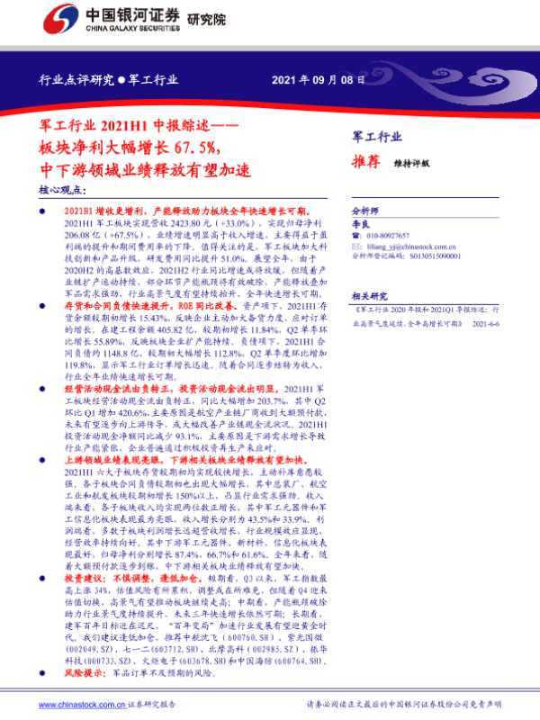 【银河证券】【20210908】军工行业2021H1中报综述:板块净利大幅增长67.5%,中下游领域业绩释放有望加速-10页