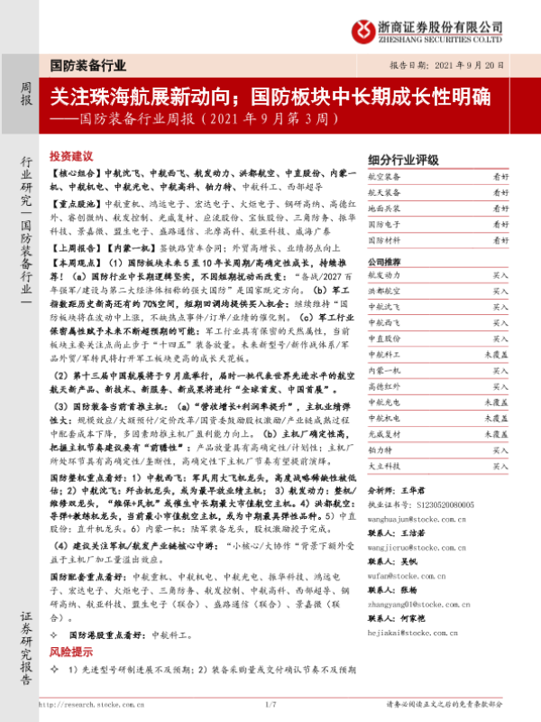 【浙商证券】【20210920】国防装备行业周报(2021年9月第3周):关注珠海航展新动向;国防板块中长期成长性明确-7页