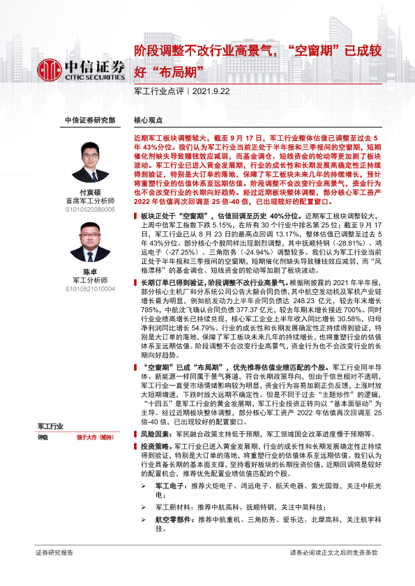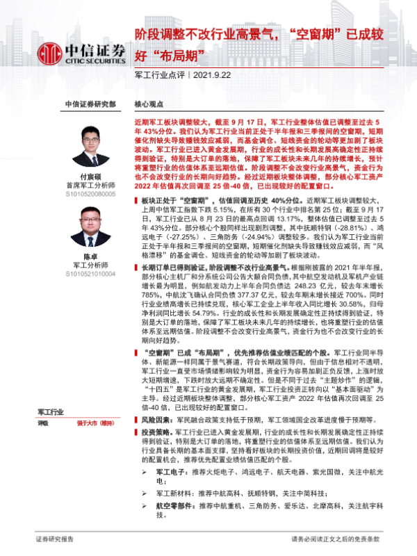 【中信证券】【20210922】20210922-中信证券-军工行业点评:阶段调整不改行业高景气,“空窗期”已成较好“布局期”-3页