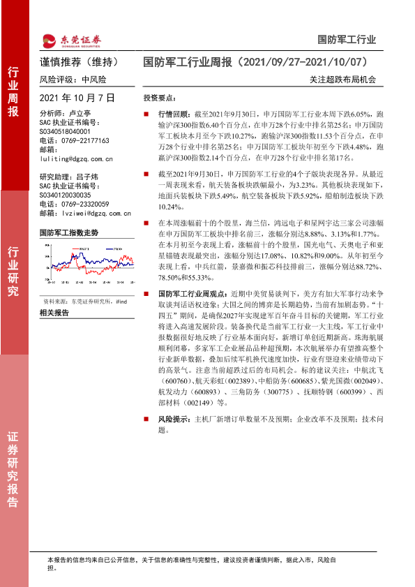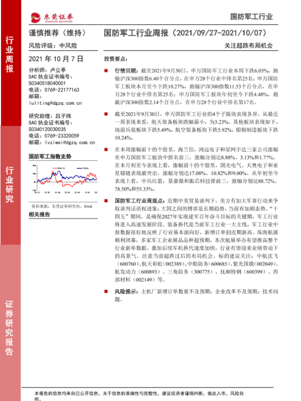 【东莞证券】【20211007】国防军工行业周报:关注超跌布局机会-9页