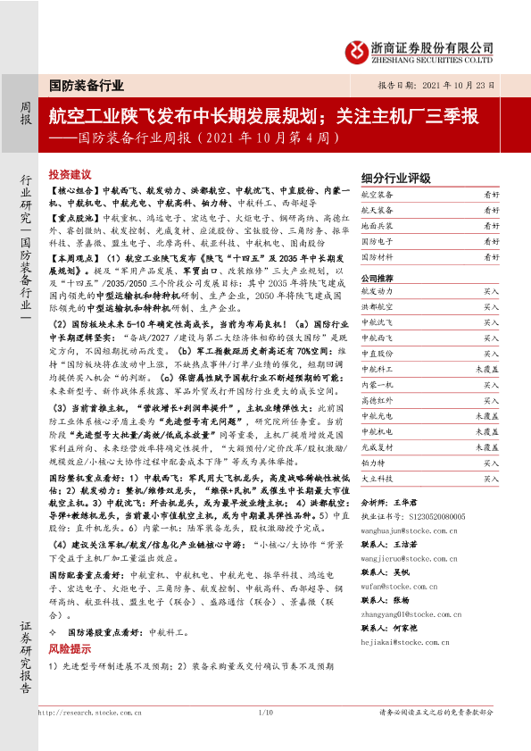 【浙商证券】【20211023】国防装备行业周报(2021年10月第4周):航空工业陕飞发布中长期发展规划;关注主机厂三季报-10页