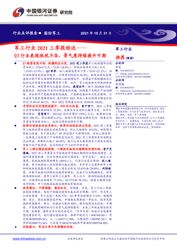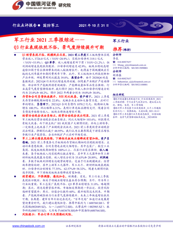 【银河证券】【20211031】军工行业2021三季报综述——Q3行业表现依然不俗,景气度持续提升可期-10页