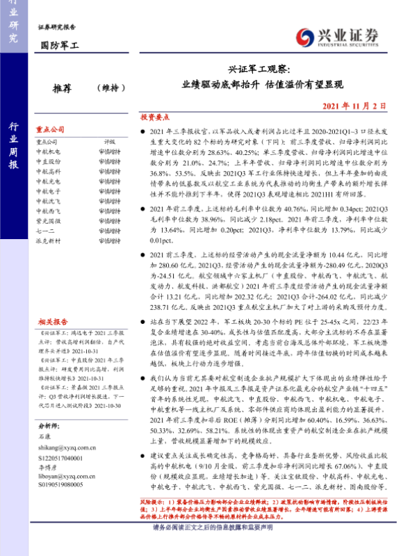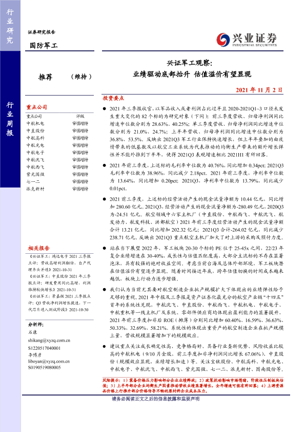 【兴业证券】【20211102】兴证军工观察:业绩驱动底部抬升估值溢价有望显现-32页
