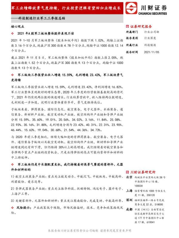 【川财证券】【20211105】科技制造行业军工三季报总结:军工业绩释放景气度持续,行业投资逻辑有望回归业绩成长-18页