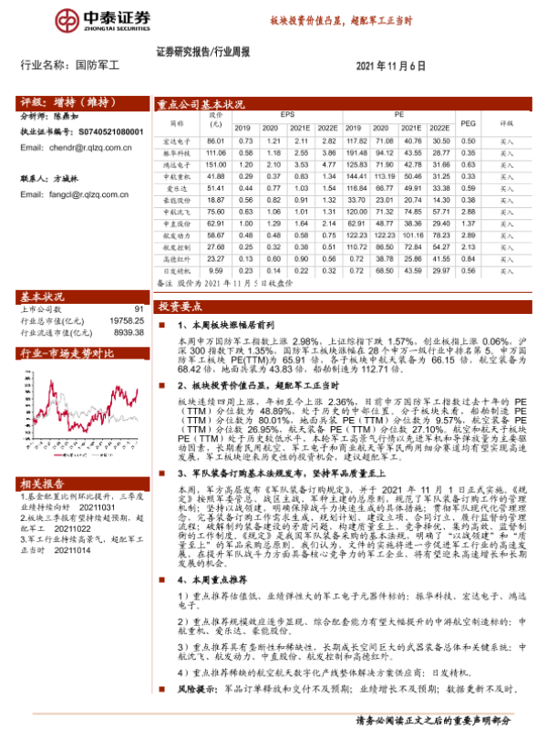 【中泰证券】【20211106】20211106-中泰证券-国防军工行业周报:板块投资价值凸显,超配军工正当时-18页