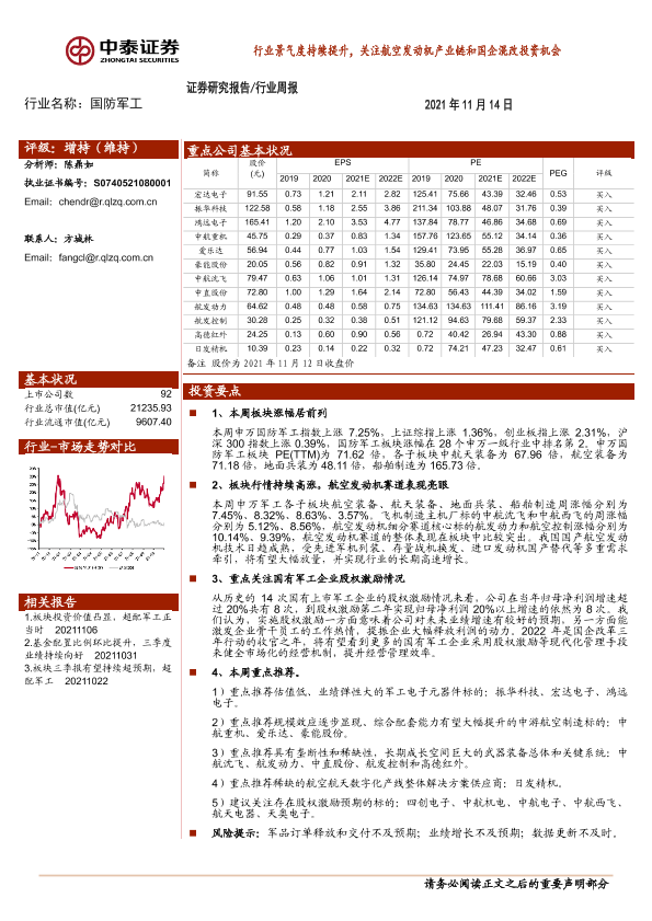 【中泰证券】【20211114】20211114-中泰证券-国防军工行业周报:行业景气度持续提升,关注航空发动机产业链和国企混改投资机会-19页