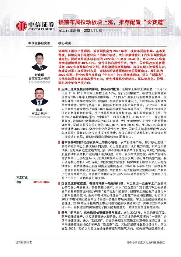 【中信证券】【20211115】20211115-中信证券-军工行业周报:提前布局拉动板块上涨,推荐配置“长赛道”-3页