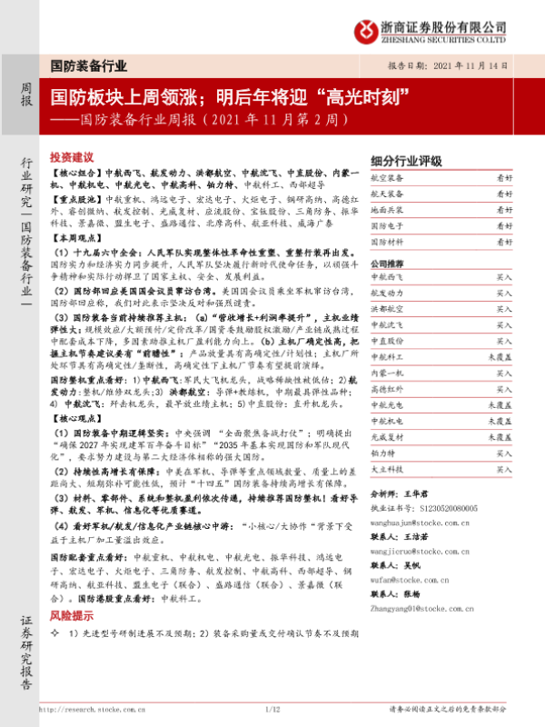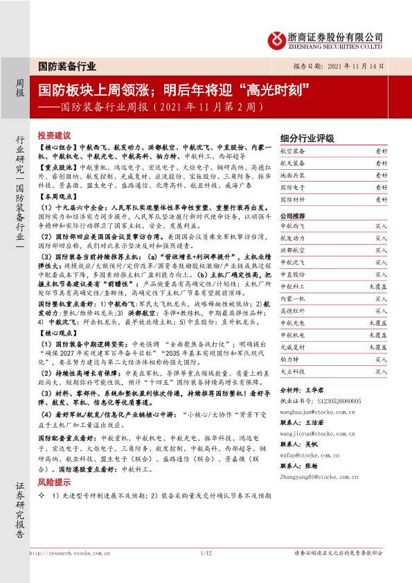 【浙商证券】【20211114】国防装备行业周报(2021年11月第2周):国防板块上周领涨;明后年将迎“高光时刻”-12页