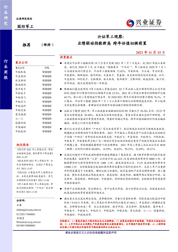 【兴业证券】【20211115】兴证军工观察:业绩驱动指数新高 跨年估值切换前置-22页