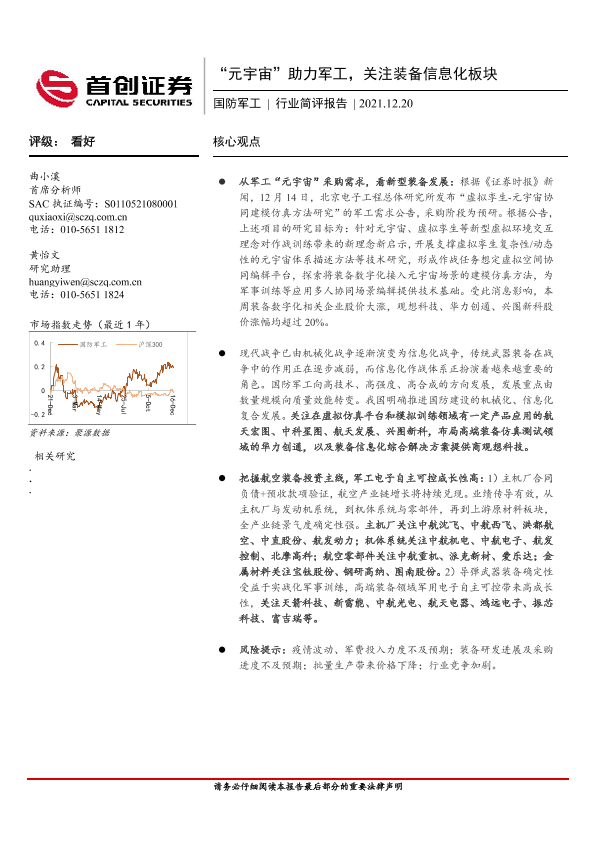 【首创证券】【20211220】国防军工行业简评报告:“元宇宙”助力军工,关注装备信息化板块-5页