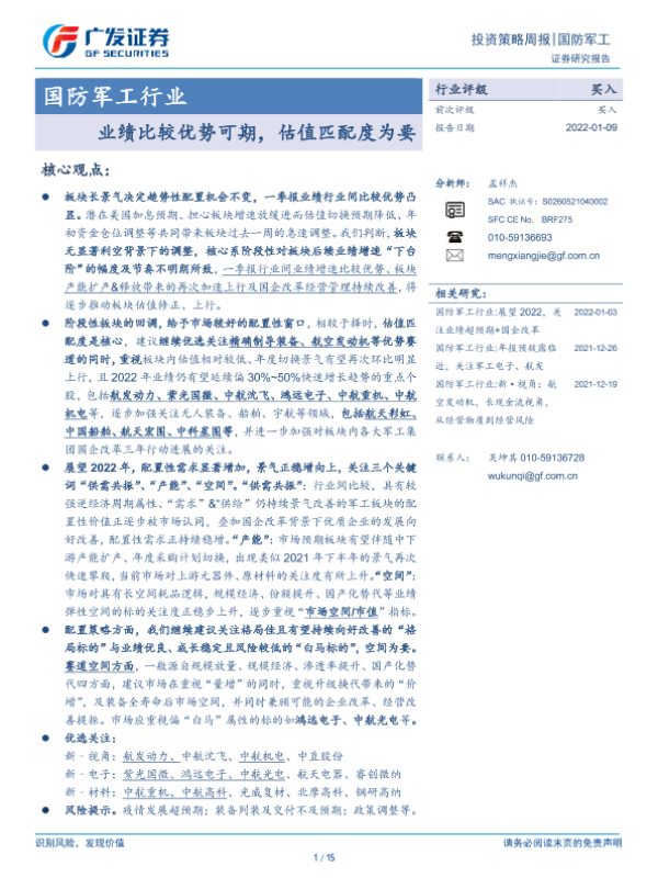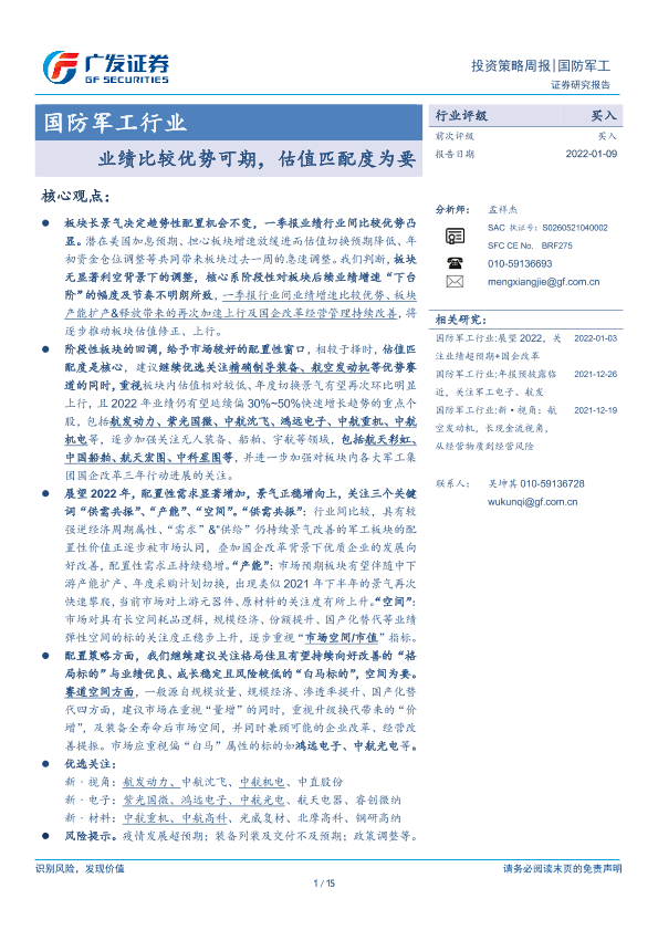【广发证券】【20220109】国防军工行业:业绩比较优势可期,估值匹配度为要-15页