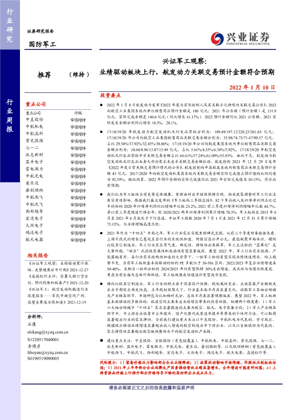 【兴业证券】【20220110】兴证军工观察:业绩驱动板块上行,航发动力关联交易预计金额符合预期-22页