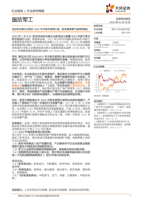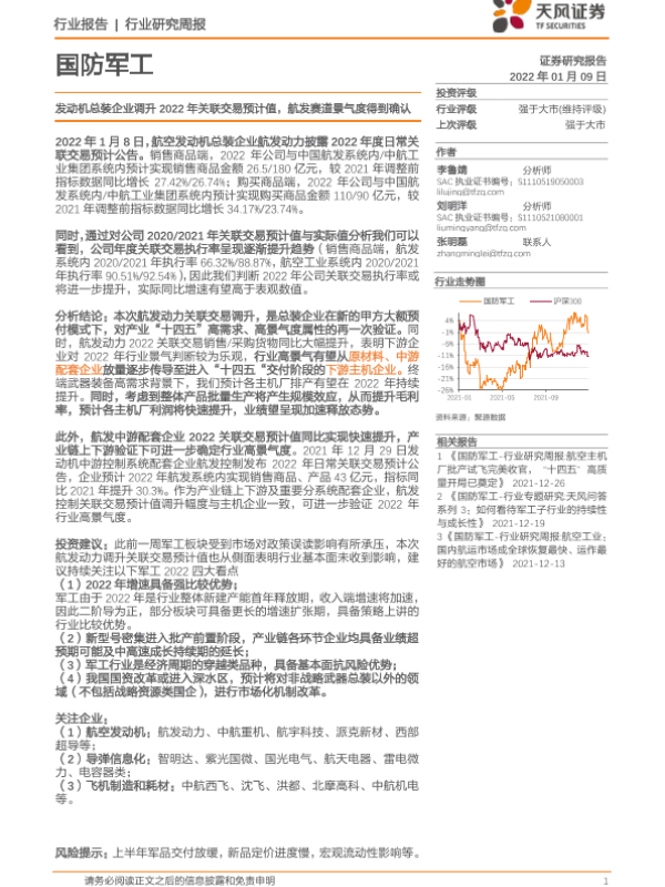 【天风证券】【20220109】国防军工行业研究周报:发动机总装企业调升2022年关联交易预计值,航发赛道景气度得到确认-3页