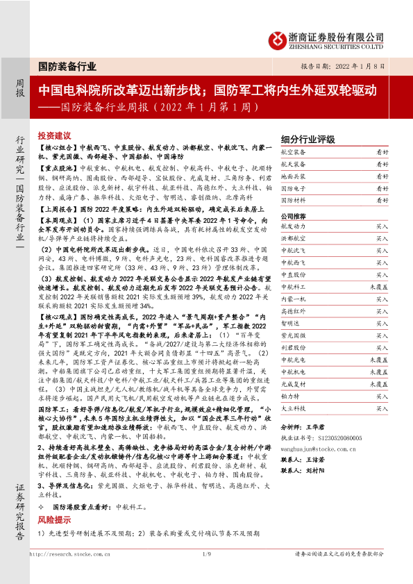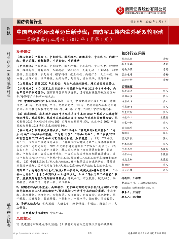 【浙商证券】【20220108】国防装备行业周报(2022年1月第1周):中国电科院所改革迈出新步伐;国防军工将内生外延双轮驱动-9页