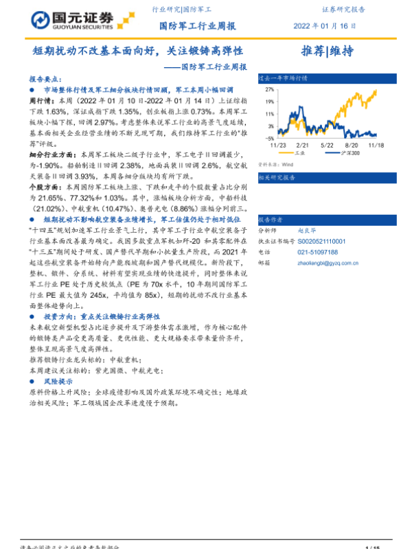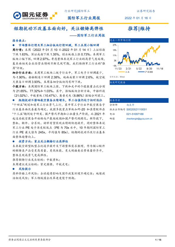 【国元证券】【20220116】20220116-国元证券-国防军工行业周报:短期扰动不改基本面向好,关注锻铸高弹性-15页
