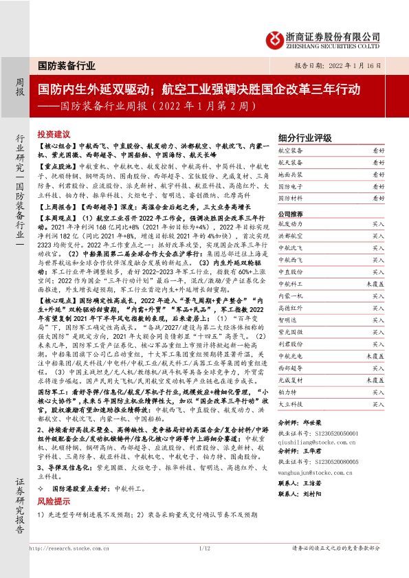 【浙商证券】【20220116】国防装备行业周报(2022年1月第2周):国防内生外延双驱动;航空工业强调决胜国企改革三年行动-12页