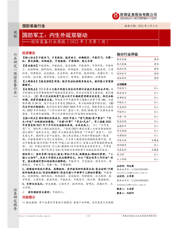 【浙商证券】【20220206】国防装备行业周报(2022年2月第1周):国防军工:内生外延双驱动-12页