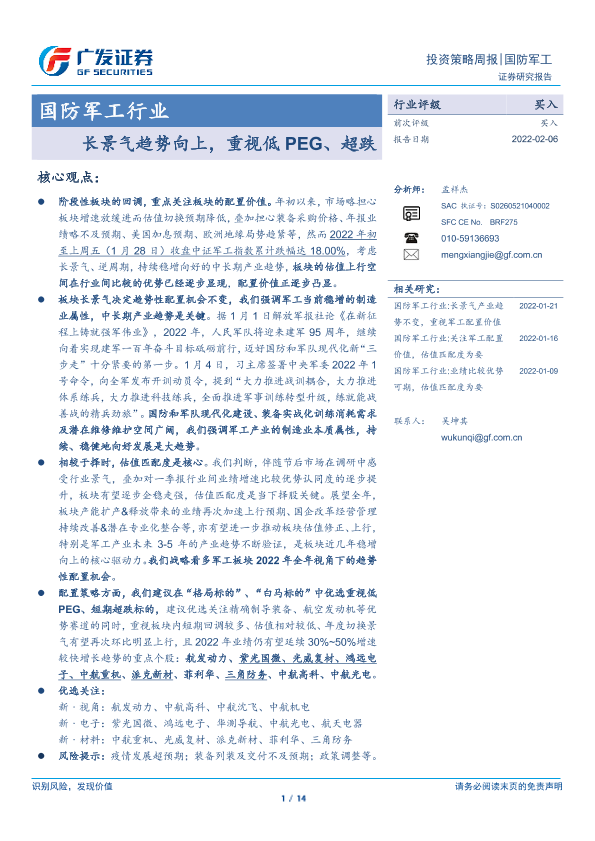 【广发证券】【20220206】20220206-广发证券-国防军工行业投资策略周报:长景气趋势向上,重视低PEG、超跌-14页