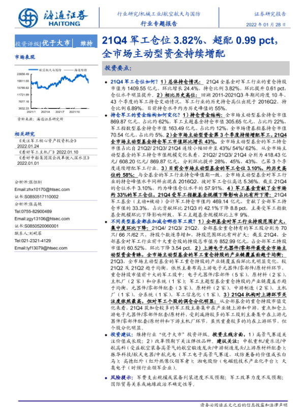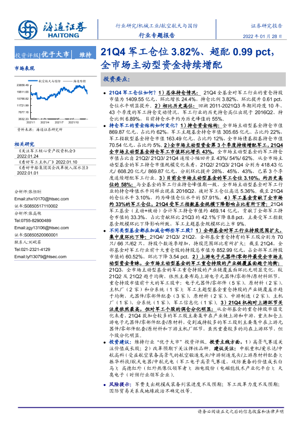 【海通证券】【20220128】20220128-海通证券-航空航天与国防行业专题报告:21Q4军工仓位3.82%、超配0.99pct,全市场主动型资金持续增配-19页