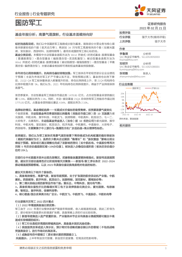 【天风证券】【20220221】20220221-天风证券-国防军工行业专题研究:基金年报分析:高景气是旗帜,行业基本面维持向好-5页