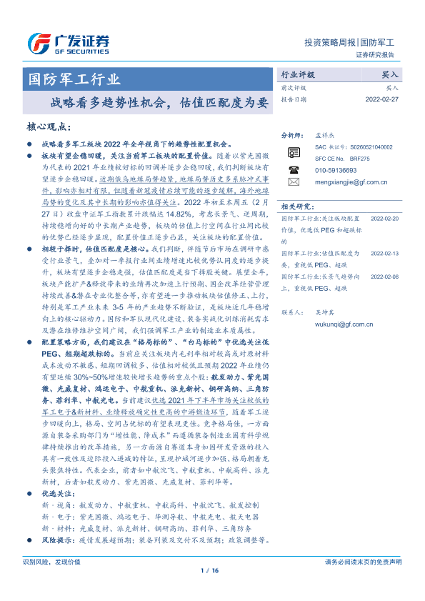 【广发证券】【20220227】20220227-广发证券-国防军工行业投资策略周报:战略看多趋势性机会,估值匹配度为要-16页