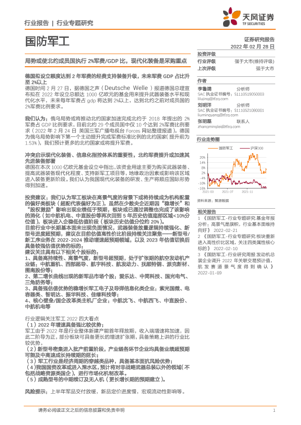 【天风证券】【20220228】国防军工行业专题研究:局势或使北约成员国执行2%军费GDP比,现代化装备是采购重点-3页