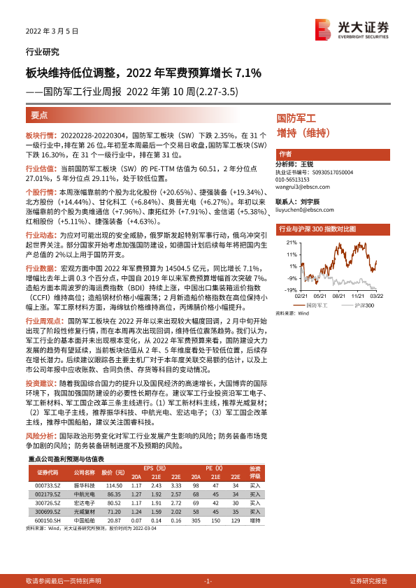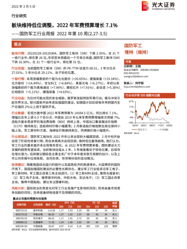 【光大证券】【20220305】国防军工行业周报2022年第10周:板块维持低位调整,2022年军费预算增长7.1%-9页