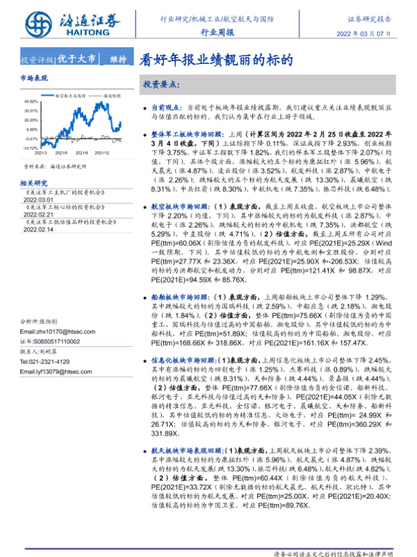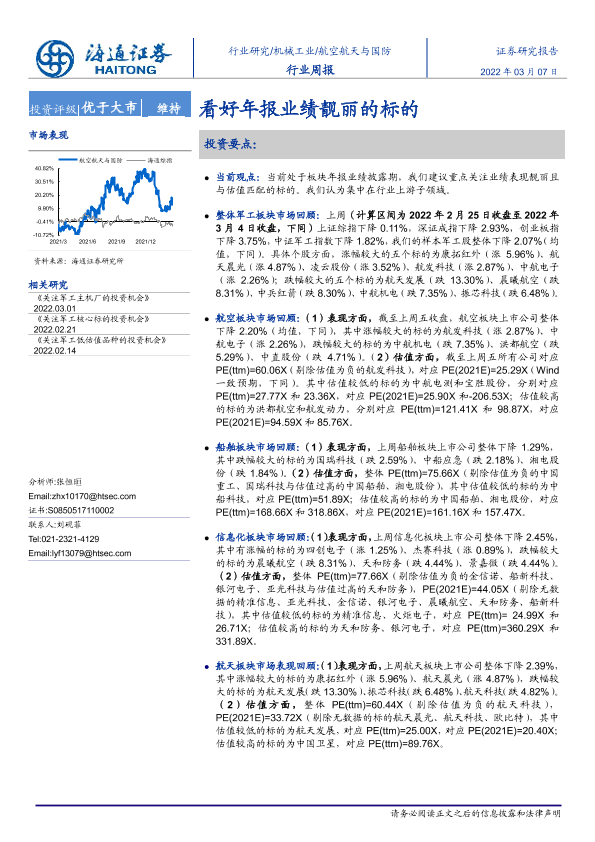 【海通证券】【20220307】20220307-海通证券-航空航天与国防行业周报:看好年报业绩靓丽的标的-4页