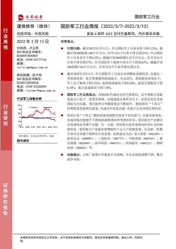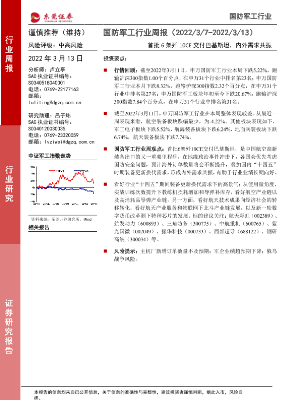 【东莞证券】【20220313】20220313-东莞证券-国防军工行业周报:首批6架歼10CE交付巴基斯坦,内外需求共振-11页